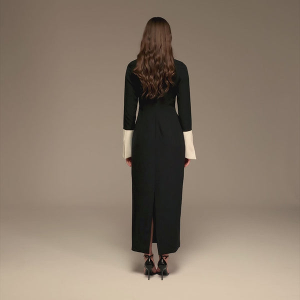 فستان ماكسي كريب بياقة بيضاء وأساور على الأكمام تضيف تباين لوني وتوازن للتصميم. تنتهي الأكمام بأساور واسعة مع فتحات صغيرة عند المعصم لمظهر أنثوي وسهولة في الحركة. تعطي القصة المستقيمة طولًا للجسم وتحديدًا للقوام، وتنتهي بفتحة خلفية تضيف لمسة كلاسيكية أنيقة وحرية في كل خطوة.